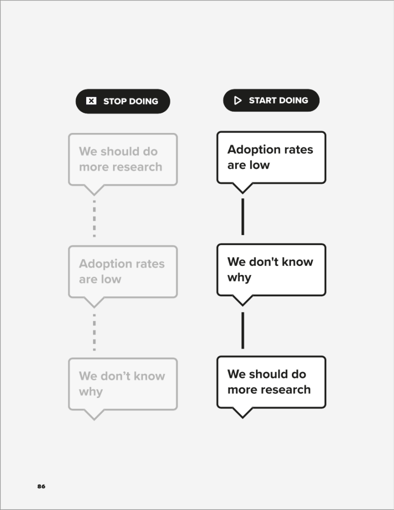 Again, most designers communicate their storytelling starting from the Resolution—which you want to avoid if you want to communicate your plan effectively, be it to your manager, stakeholders, or senior leadership.